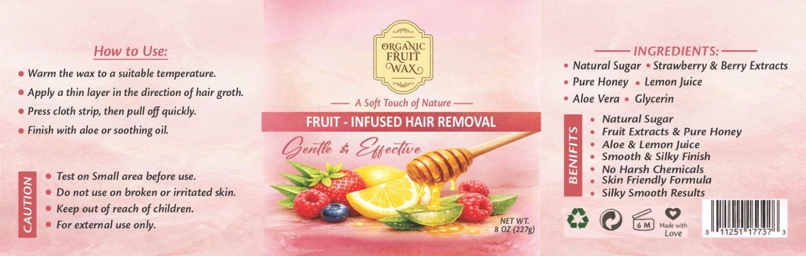 500g Strawberry Fruit Wax is a natural, fruit-infused waxing solution designed for smooth and effective hair removal. Enriched with strawberry and berry extracts along with honey and aloe vera, it helps nourish and protect the skin during waxing.